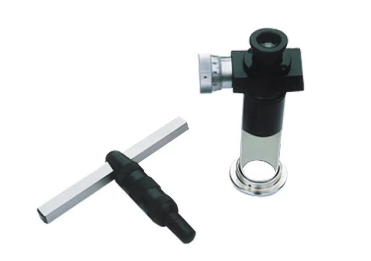 儀器主要由支架、條形硬度塊、鋼球和讀數顯微鏡組成,試驗時用錘子敲擊支架頂部,鋼球會同時壓入試樣和硬度塊中,在試樣和硬度塊上留下壓痕,兩個壓痕具有一定的比例關系,分別測出兩個壓痕直徑,查表,就可得到試樣的布氏硬度值。
