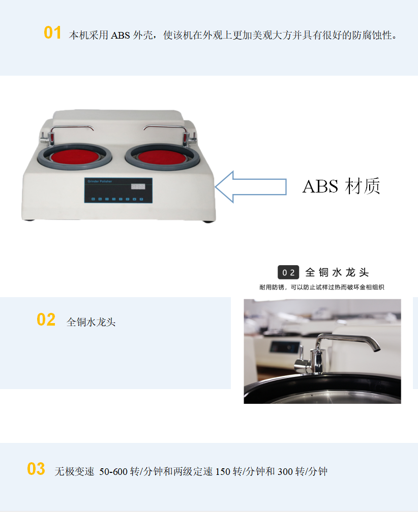 本機帶有冷卻裝置,可以在研磨拋光時對試樣進行冷卻,以防止因試樣過熱而破壞金相組織。該機使用方便、安全可靠,是工廠、科研單位以及大專院校實驗室的理想制樣設備。