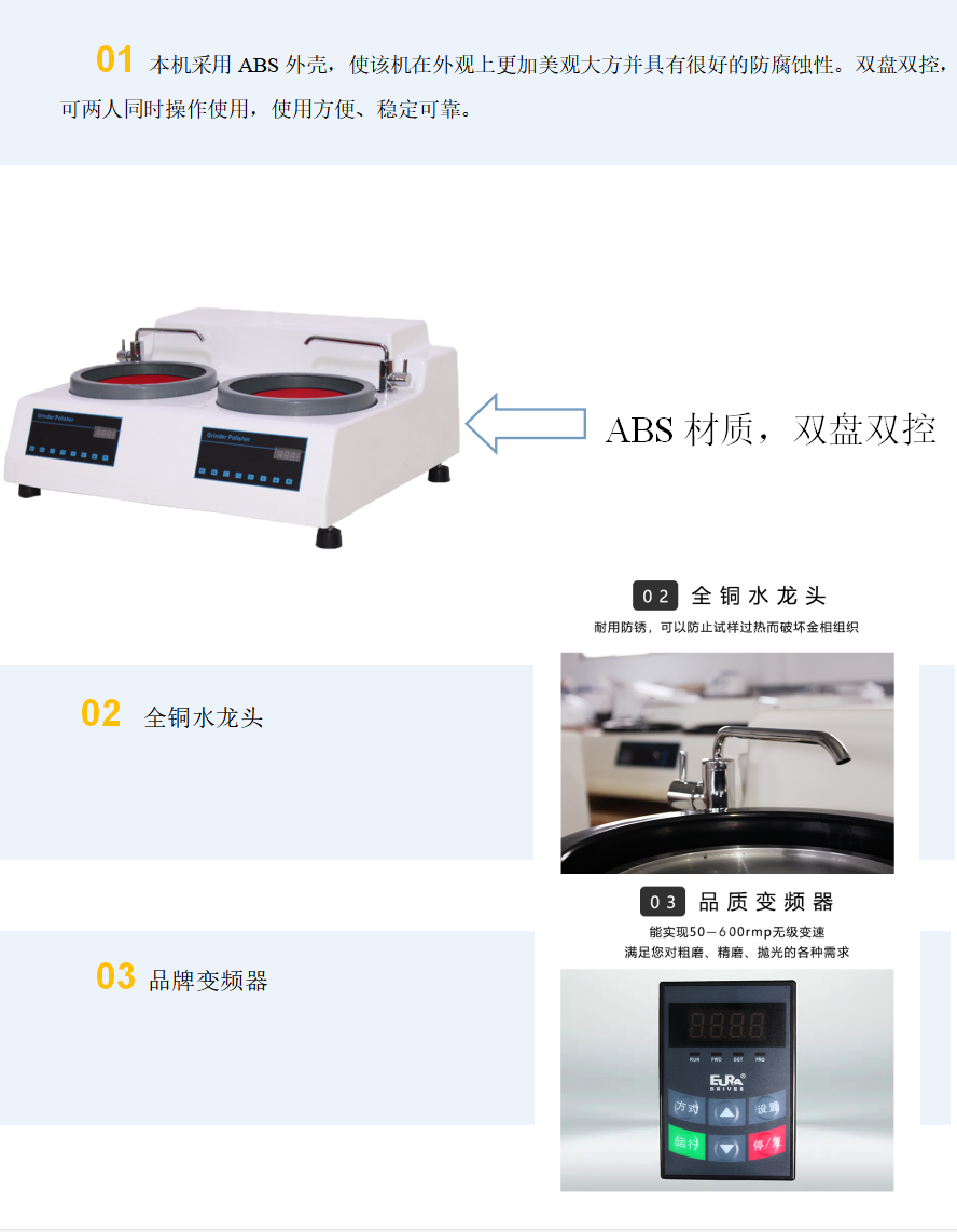 本機帶有冷卻裝置,可以在研磨拋光時對試樣進行冷卻,以防止因試樣過熱而破壞金相組織。該機使用方便、安全可靠,是工廠、科研單位以及大專院校實驗室的理想制樣設備。